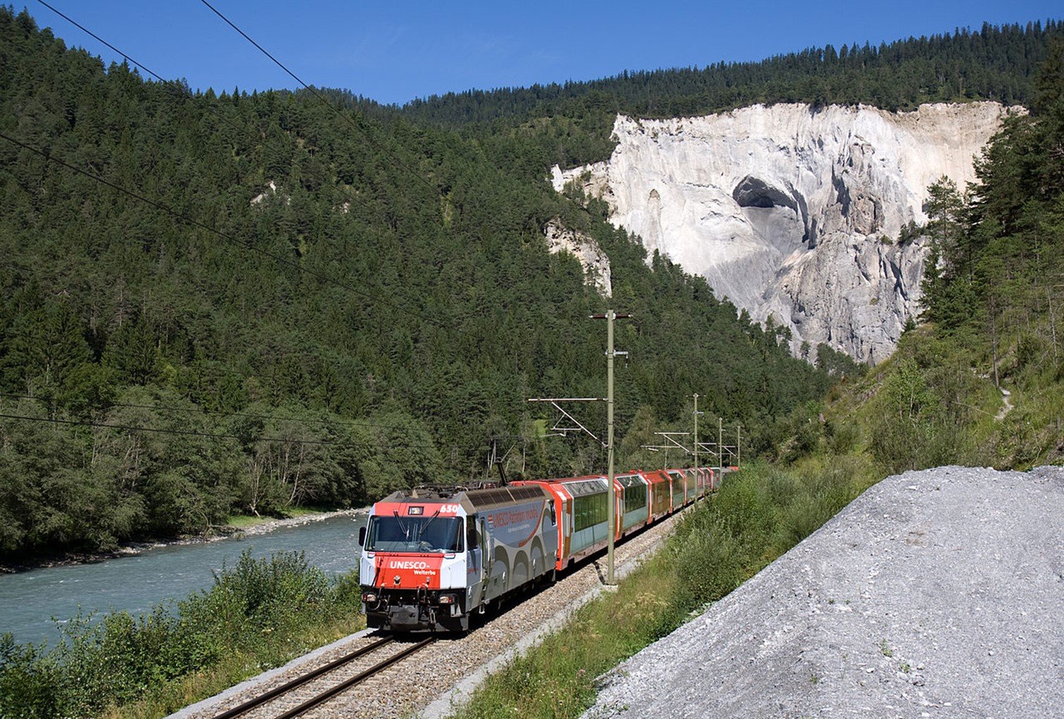 De Coire (584 m), nous remontons vers Saint Moritz (1775 m) par la vallée de l’Albula. Cette ligne est classée au patrimoine mondiale de l’UNESCO. Nous passons près de la ville de Davos, connu pour son rassemblement annuel.